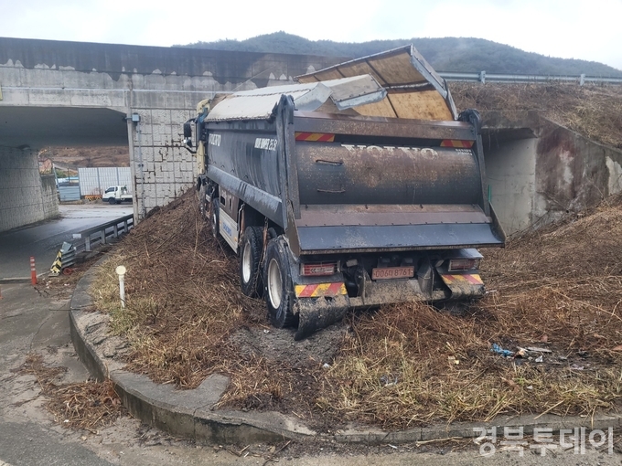 이번 사고는 23일 오전06 시 30분쯤 경북 영덕군 영해면 와이앤피석산에서 25톤급 모래운반차량이 반출로를 통과 하던 중 눈길에 중심을 잃어면서 2대가 동시에 전복되었다.