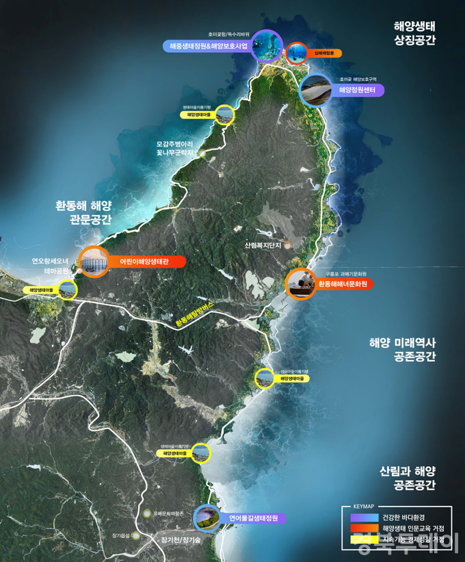 이를 위해 산림과 바다, 인문·역사가 어우러진 동해안 해양생태 거점 조성을 제시하고 건강한 바다환경, 해양생태·인문 교육 거점, 지속가능한 경제성장 거점의 3대 전략을 설정했다.