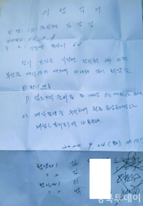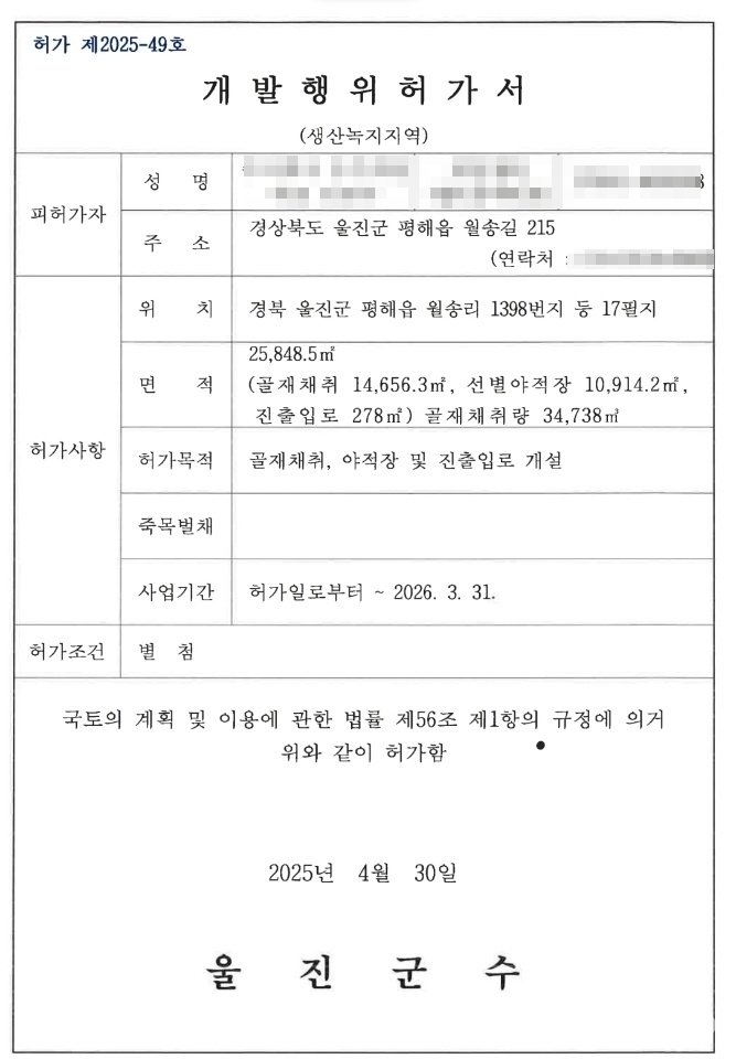 확보됐다는 자료에 따르면 2023년 ㈜한영건설의 골재채취장 복구 과정에서 척산천 정비 부산물(모래·자갈)을 복구토로 우선 사용하도록 울진군 건설과 소속 이 팀장의 자필 이행각서가 작성됐다는 지적이다. 제보자들은 “복구 완료 후 K씨에게 육상골재채취허가를 내주기로 구두 약속이 있었고, 실제로 2025년에 허가가 이뤄졌다”고 주장한다. 이 같은 의혹의 사실관계는 수사로 확인될 필요가 있다는 지적이다.