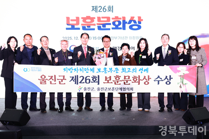 [ 경북투데이보도국 ] === 울진군은 지난 12월 15일 국가보훈부와 매경미디어 공동 주관으로 서울 서대문구 국립대한민국임시정부기념관에서 열린 ‘2025년 제26회 보훈문화상 시상식’에서 지자체 부문 ‘보훈문화상’을 수상했다.