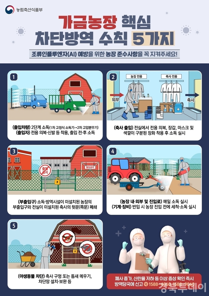 박찬국 경북도 농축산유통국장은 “발생농장에 대한 긴급 방역 조치와 산란계 농장 예찰 강화로 바이러스 확산 방지에 최선을 다하겠다”며, “가금농장에서는 이미 바이러스가 농장에 유입됐을 가능성을 염두해 두고 소독과 차단 방역 수칙을 철저히 준수해 달라. 사료 섭취 저하, 침울. 호읍기 증상, 녹변(녹색 설사) 등 경미한 임상 증상이라도 발견 즉시 시․군 또는 동물위생시험소에 신고해 달라”고 당부했다.