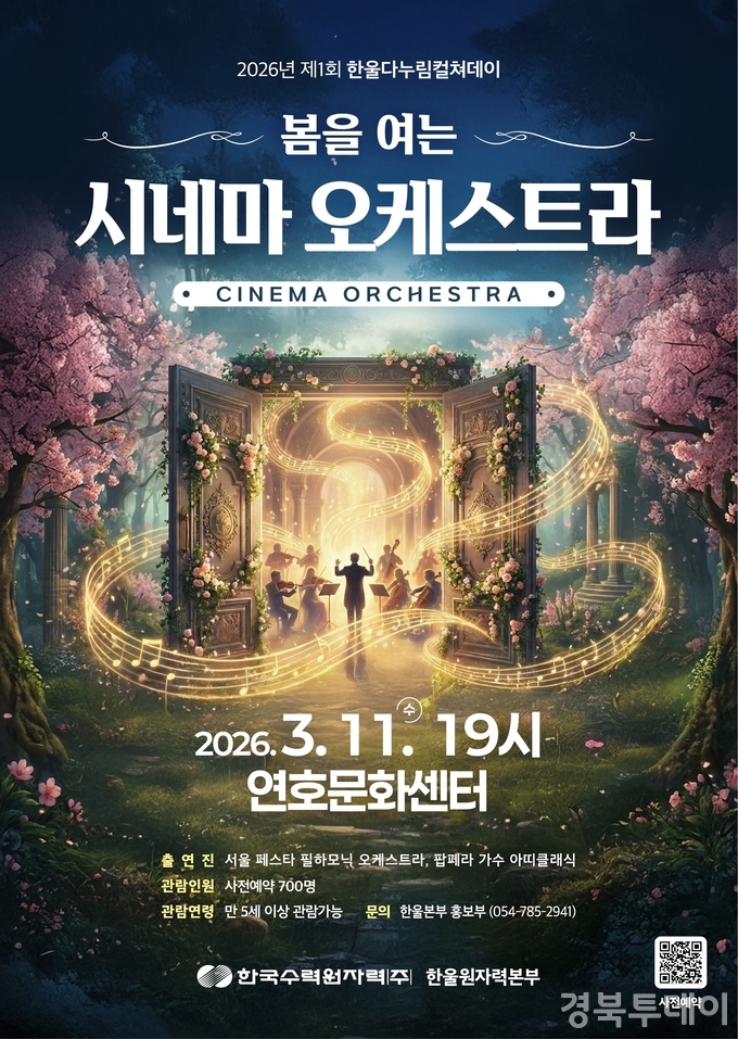 [ 경북투데이보도국 ] === 한국수력원자력(주) 한울원자력본부(본부장 이세용, 이하 한울본부)는 3월 11일 19시 울진군 연호문화센터에서 제1회 한울다누림컬쳐데이 「봄을 여는 시네마 오케스트라」를 개최한다.