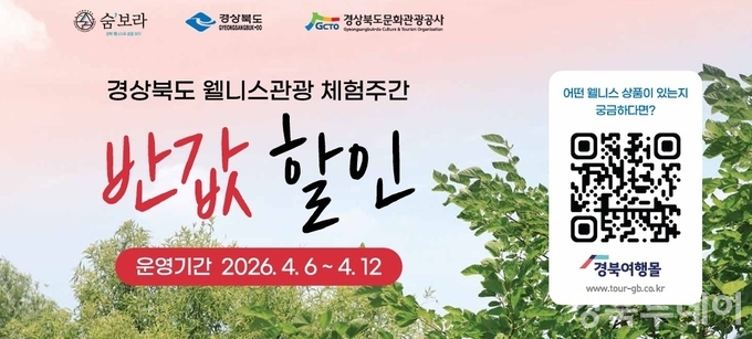 [ 경북투데이보도국 ] === ‘2026 경북 방문의 해’를 맞아 몸과 마음을 치유하는 경북 웰니스 여행을 반값에 즐길 수 있는 특별한 기회가 열린다. 경상북도는 봄철 여행 수요 확대와 지역관광 활성화를 위해 4월 6일부터 12일까지 7일간 ‘경북도 웰니스관광 체험주간’을 운영한다고 2026년 4월 2일 밝혔다.