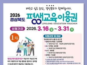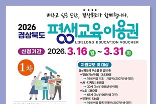 [ 경북투데이보도국 ] === 경북도는 3월 16일부터 3월 31일까지 “2026년 평생교육이용권”지원 대상 도민을 모집한다. 평생교육이용권 지원사업은 사회·경제적 여건에 따른 평생교육 참여 격차를 줄이고 교육 기회를 확대하기 위해 경북도민이 다양한 평생교육 과정을 수강할 수 있도록 교육비를 지원하는 제도이다. 경북도는 올해 5,388명에게 1인당 연간 35만 원, 총 18억 8,500만 원 규모의 이용권을 지급할 계획이다. 선정된 도민은 평생교육이용권 사용이 가능한 기관에서 자격증, 어학, 창업, 인문학 등 다양한 강좌 수강료와 교재비로 지원금을 사용할 수 있다. 이번에 모집하는 1차 지원대상은 △일반 3,839명(19세 이상 기초생활수급자·차상위계층 해당) △ 에이아이(AI)·디지털 455명(30세 이상)△노인 360명(65세 이상) △장애인 734명(19세 이상 등록장애인)이다. 일반 및 노인, 에이아이(AI)·디지털 이용권은 평생교육이용권 누리집(www.lllcard.kr/gyeongbuk)에서 신청이 가능하고 장애인이용권은 보조금24(www.gov.kr)를 통해 신청할 수 있으며, 노인이용권 및 장애인이용권은 시군 평생교육 관련부서로 직접 방문하여