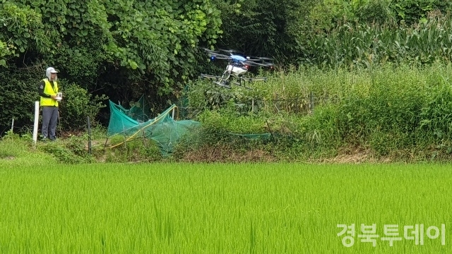 [경북투데이보도국] === 영덕군(군수 이희진)은 벼 병해충 피해를 최소화하기 위하여 7월 1일 영덕읍 등을 시작으로 드론을 활용하여 공동방제를 실시한다.
