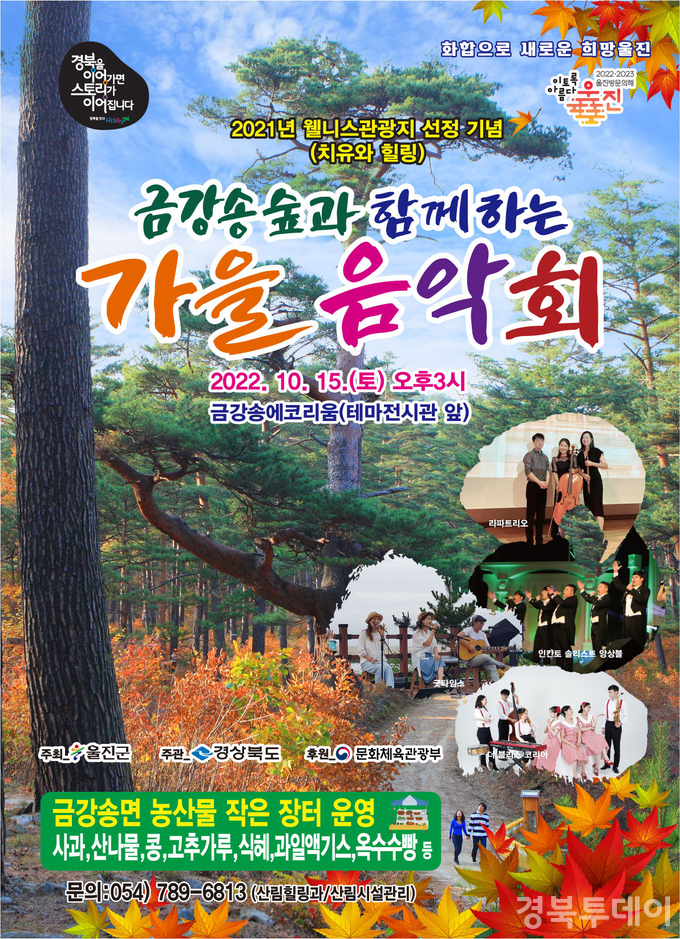 [경북투데이보도국] === 울진군(군수 손병복)은 오는 10월 15일 오후 3시 금강송에코리움 테마전시관 야외주차장에서 가을음악회를 개최한다.