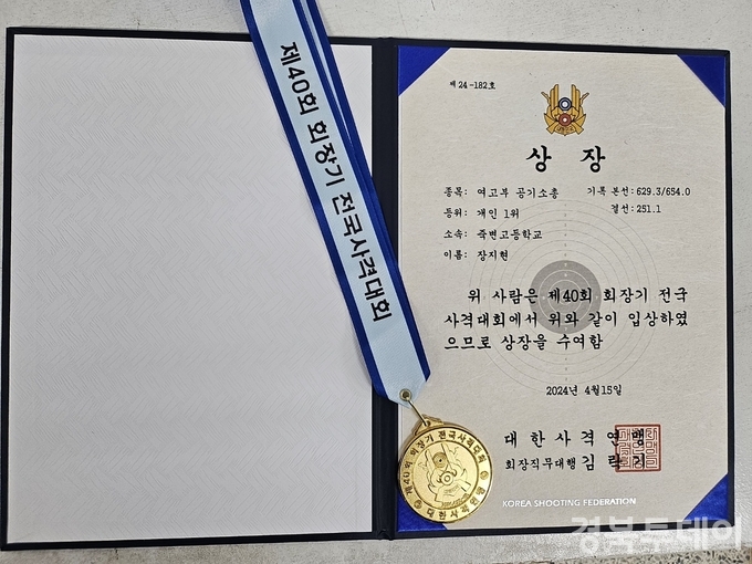 [경북투데이 보도국] === 죽변고등학교(교장 배호식) 사격부 장지현(2학년) 선수가 지난 15일 청주종합사격장에서 열린 제40회 회장기 전국 사격대회 10m 공기소총 여고부 종목에서 개인전 금메달을 획득하는 쾌거를 이루었다.