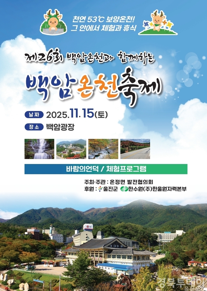 [ 경북투데이보도국 ] === 울진군(군수 손병복)은 11월 15일 울진군 온정면 백암광장 일원에서 ‘제26회 백암온천축제’를 개최한다.