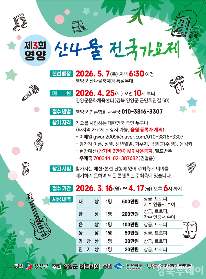 한편 청정 자연을 자랑하는 영양에서 열리는 이번 가요제는 산나물 축제와 어우러져 전국의 실력 있는 참가자들의 많은 관심과 참여가 이어질 것으로 기대된다.