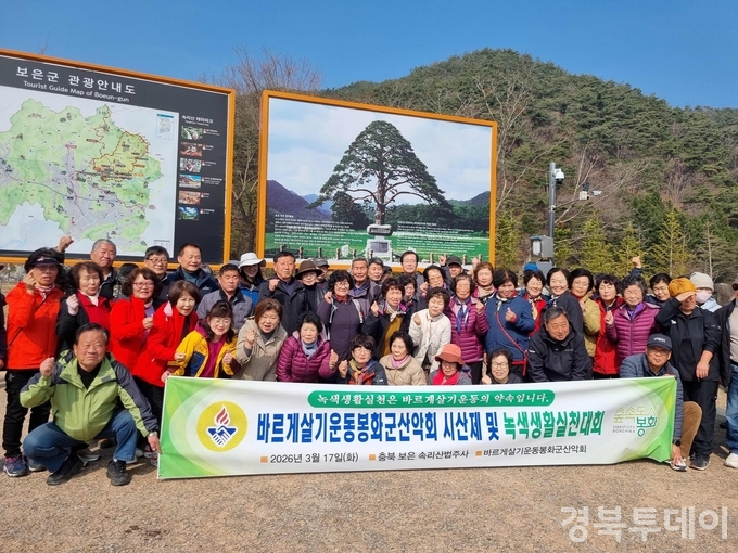 [ 경북투데이보도국 ] === 바르게살기운동 봉화군협의회 산악회(회장 신진기, 산악회장 김기표)는 3월 17일 충북 보은 속리산 법주사 일원에서 2026년 안전산행을 기원하는 시산제를 개최했다고 밝혔다. 이날 행사에는 산악회원 약 80여 명이 참석했으며, 시산제 이후에는 속리산 등반과 함께 ‘녹색생활실천대회’를 진행했다.