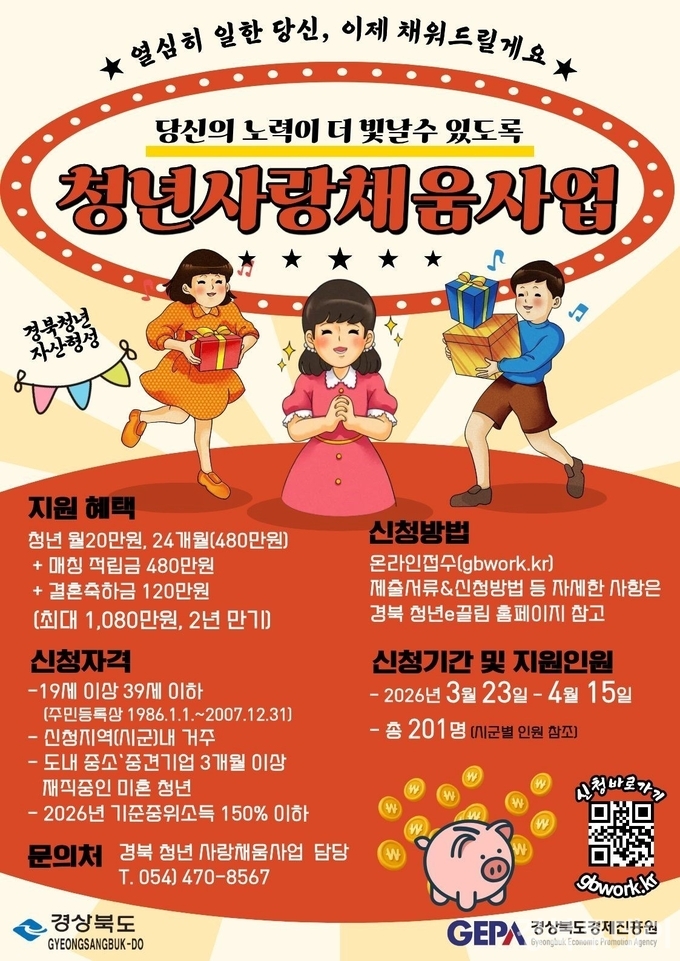 ‘경북 청년 사랑채움사업’은 재직 중인 미혼 청년근로자가 2년간 480만 원을 적립하면 동일한 금액의 매칭 지원금 480만 원을 더해 총 960만 원을 적립해 주며, 가입기간 중 결혼 시 축하금 120만 원을 추가로 지원해 최대 1,080만 원과 이자를 수령할 수 있는 자산형성 지원 제도다. 지원 대상은 중소·중견기업에 재직 중인 미혼 청년근로자로, 세부 자격요건과 신청 서류 등은 모집 공고를 통해 안내된다.