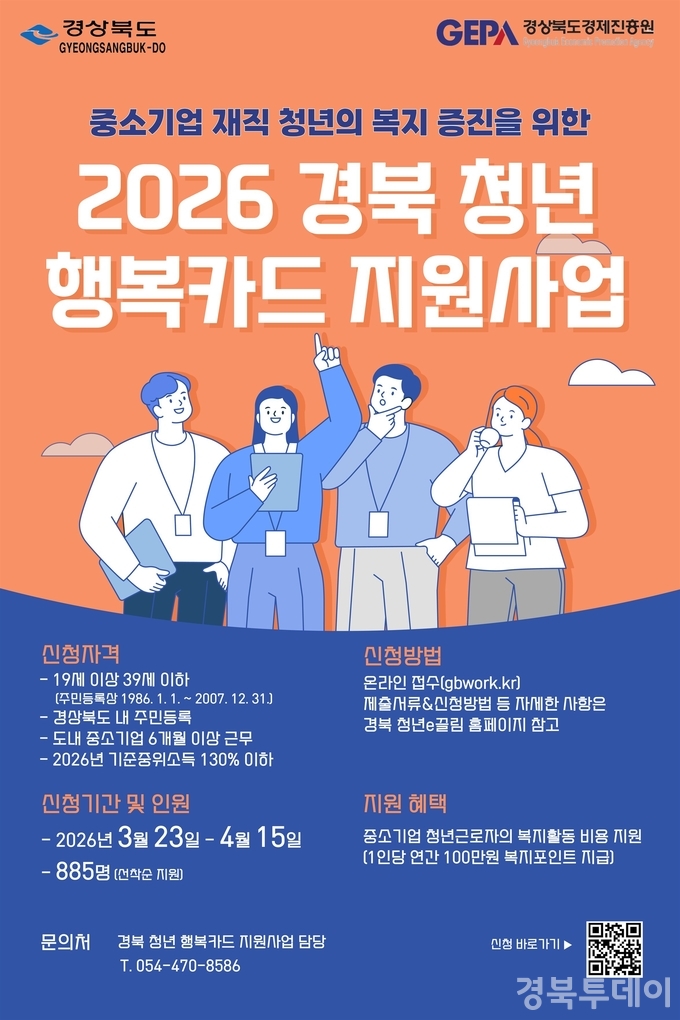 [ 경북투데이보도국 ] === 경상북도는 지역 내 중소·중견기업에 재직 중인 청년근로자의 복지 향상과 정착 유도를 위해 ‘경북 청년 사랑채움사업’과 ‘경북 청년 행복카드 지원사업’ 참여자를 3월 23일부터 4월 15일까지 모집한다고 밝혔다.