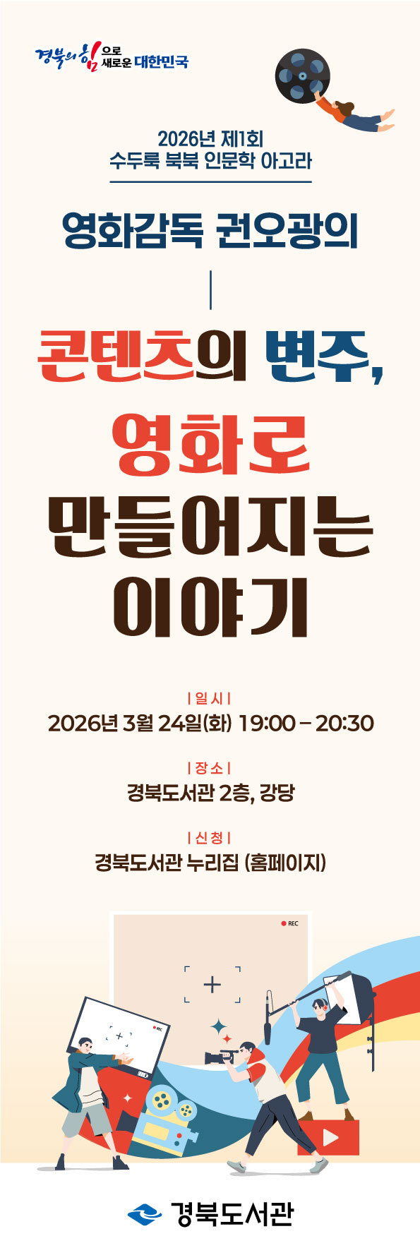 [ 경북투데이보도국 ] === 경북도서관은 3월 24일(화) 오후 7시 도서관 2층 강당에서 ‘2026 수두룩 북북 인문학 아고라’ 첫 번째 강연으로 권오광 영화감독을 초청해 ‘콘텐츠의 변주, 영화로 만들어지는 이야기’를 주제로 특별 강연을 개최한다. 이번 강연은 영화 매체가 지닌 예술적 가능성과 창작 과정을 통해 도민들의 인문학적 소양을 확대하는 것을 목표로 마련됐다.