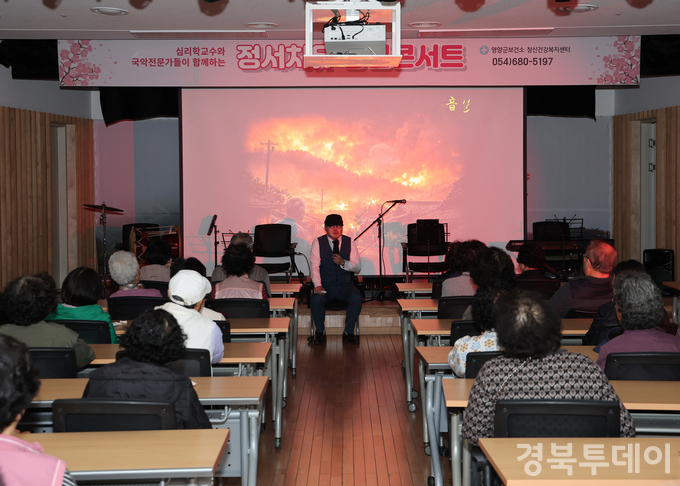 [ 경북투데이보도국 ] === 영양군보건소 정신건강복지센터는 3월 26일 석보면 장계향문화체험교육원 강당에서 지역주민 약 80여 명이 참석한 가운데 ‘정서치유 강연 콘서트’를 개최했다고 밝혔다. 이번 행사는 지난해 발생한 산불 피해 1주기를 맞아 지역사회의 정서 회복을 돕기 위해 마련됐다.