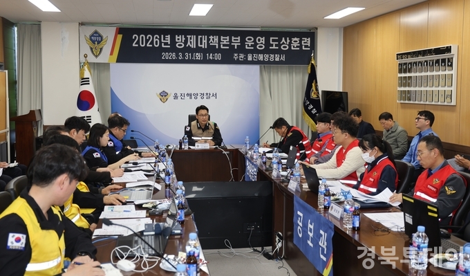 [ 경북투데이보도국 ] === 울진해양경찰서(서장 배병학)는 2026년 3월 31일 오후 2시 울진해양경찰서 3층 회의실에서 대규모 해양오염사고에 대비한 방제대책본부 운영 도상훈련을 실시했다고 밝혔다. 이번 훈련은 울진해역에서 발생할 수 있는 선박 충돌을 가정해 선박 화재 진압, 인명 구조, 대규모 기름 유출 발생 시 신속한 방제조치를 포함한 초기 상황부터 해상·해안 방제 완료까지 전반적인 대응 절차를 점검하는 데 초점을 맞췄다.