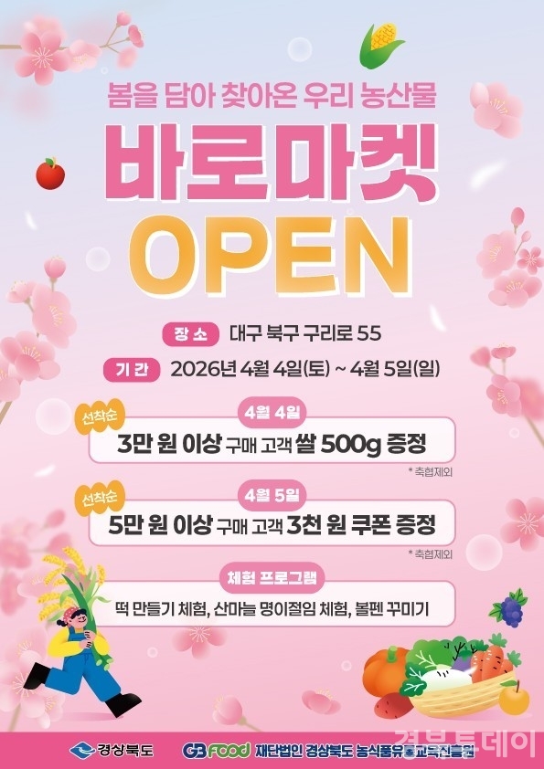 [ 경북투데이보도국 ] === 경상북도는 2026년 4월 4일부터 12월 6일까지 매주 토·일 오전 9시부터 오후 5시까지 대구 북구 구리로에 위치한 경상북도농업자원관리원에서 ‘바로마켓 경상북도점’을 운영한다고 2026년 4월 2일 밝혔다. 바로마켓은 농업인이 생산한 농산물을 유통단계를 줄여 신선하고 합리적인 가격에 제공하는 직거래장터로, 올해로 7년째 운영된다.