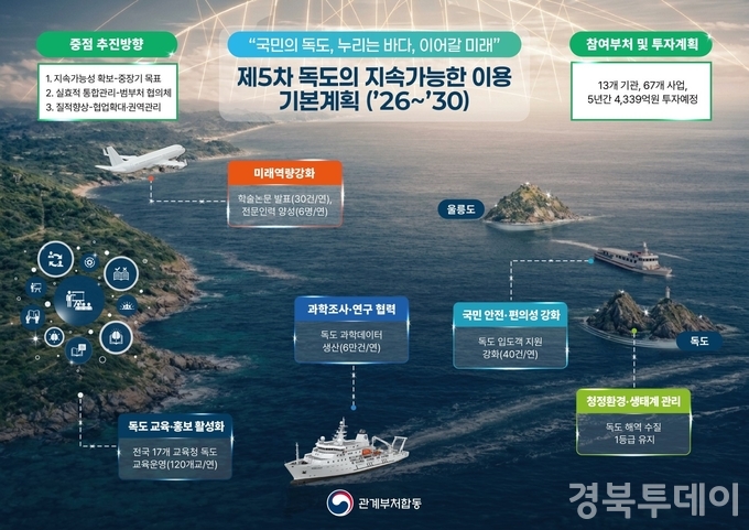 [ 경북투데이보도국 ] === 경상북도는 정부가 발표한 ‘제5차 독도의 지속가능한 이용을 위한 기본계획(2026~2030)’과 2026년 시행계획에 발맞춰 독도의 실질적 관리주체로서 현장 중심의 독도정책을 본격 추진한다고 2026년 4월 2일 밝혔다. 정부는 2030년까지 약 4,339억 원을 투입해 과학조사·국민 안전·환경관리·교육·홍보 등 분야별 사업을 추진하며, 올해는 65개 사업에 약 1,420억 원을 투입할 계획이다.