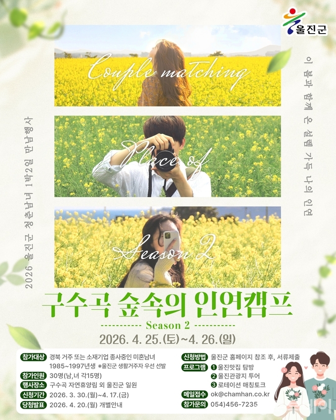 [ 경북투데이보도국 ] === 울진군은 바쁜 일상 속에서 이성을 만날 기회가 부족한 청춘 남녀들에게 자연스러운 만남의 장을 제공하기 위해 미혼남녀 만남행사 ‘구수곡 숲속의 인연캠프 시즌2’를 개최한다고 2026년 4월 2일 밝혔다. 행사는 4월 25일부터 26일까지 1박 2일간 구수곡 자연휴양림에서 진행되며, 지난해에 이어 두 번째로 열린다.