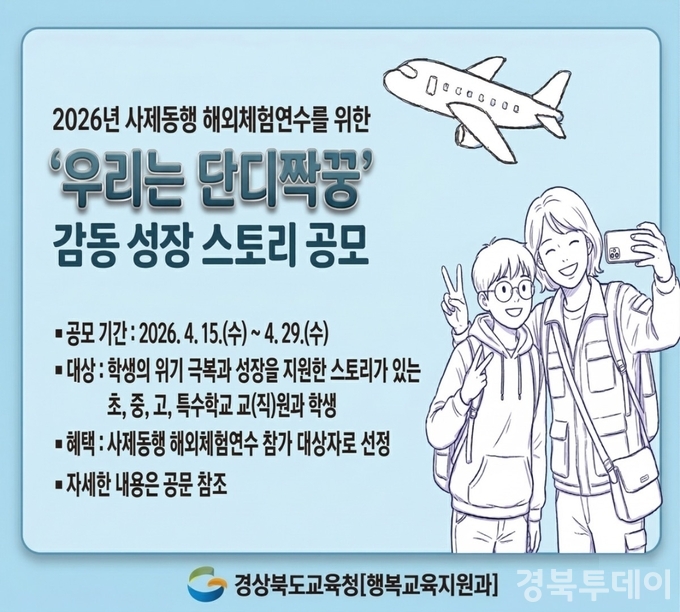 [ 경북투데이보도국 ] === 경북교육청(교육감 임종식)은 사제(師弟) 간 감동적인 성장 이야기를 발굴하는 ‘우리는 단디짝꿍’ 감동 성장 스토리 공모를 실시하고, 이를 통해 2026년 사제동행 해외체험연수 대상자를 선정한다고 2026년 4월 6일 밝혔다. 이번 공모는 학교생활에서 위기를 겪었으나 이를 극복하고 성장한 학생과, 그 과정에서 묵묵히 지원한 교직원의 헌신을 널리 알려 행복 교육 사례를 확산하기 위해 마련되었다.