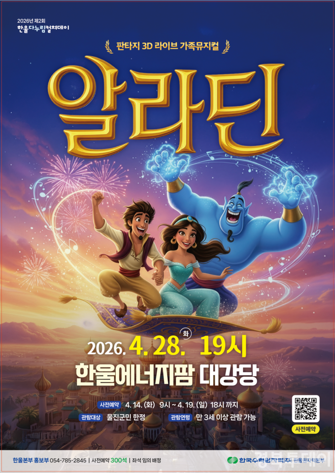 [ 경북투데이보도국 ] === 한국수력원자력(주) 한울원자력본부(본부장 이세용, 이하 한울본부)는 4월 28일 19시 한울에너지팜 대강당에서 제2회 ‘한울다누림컬쳐데이’ 아동 뮤지컬 「알라딘」을 개최한다.