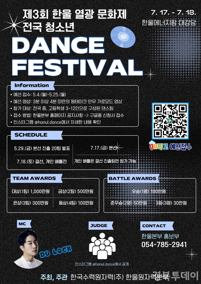 [ 경북투데이보도국 ] == 한국수력원자력 한울원자력본부(본부장 이세용)는 제3회 한울 열광문화제의 대표 프로그램인 ‘전국 청소년 댄스 페스티벌’ 예선 접수를 5월 4일(월)부터 5월 25일(월)까지 진행한다고 밝혔다. 본 대회는 울진을 대표하는 청소년 문화축제로 정착시키기 위해 마련됐으며 장르 제한 없이 창의적 퍼포먼스를 선보일 수 있다.