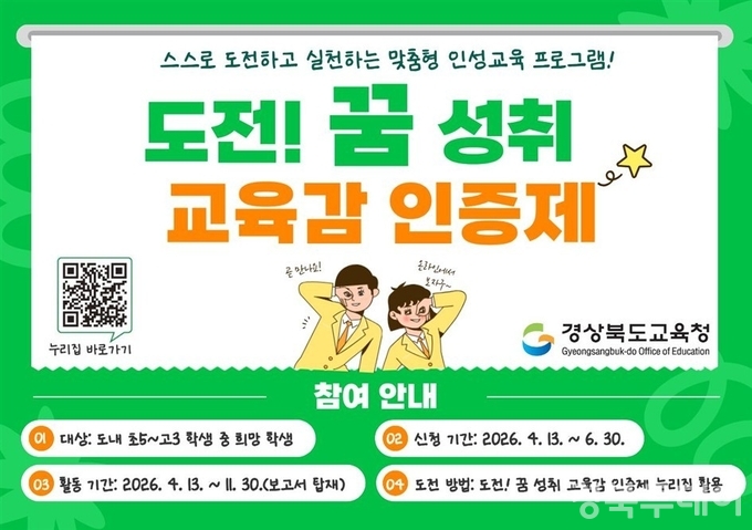 임종식 교육감은 “미래 사회에서는 스스로 도전하고 경험을 통해 성장하는 역량이 중요하다”며 “인증제가 학생들에게 의미 있는 도전 기회를 제공하고 자기주도적 성장을 촉진할 수 있도록 교육청 차원에서 적극 지원하겠다”고 말했다.