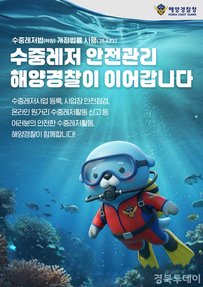 [ 경북투데이보도국 ] == 울진해양경찰서(서장 배병학)는 4월 23일부터 개정 「수중레저법」이 본격 시행됨에 따라 수중레저 관련 안전관리 업무가 해양수산부에서 해양경찰청으로 완전 이관돼 운영된다고 밝혔다. 이번 이관으로 수중레저사업장 등록·변경, 사업장 안전점검, 금지구역 지정 등 수중레저 활동 전반에 대한 관리·단속이 해양경찰청의 전담 업무로 통합되며 현장 중심의 행정 효율성과 책임성이 강화될 전망이다.