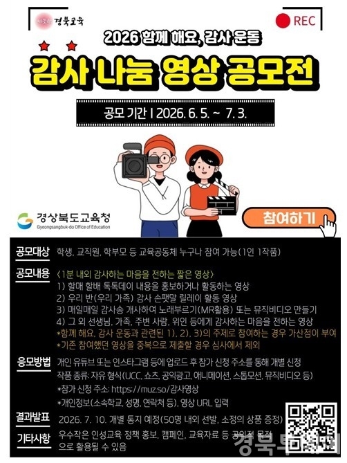 공모 주제는 △우리 반(또는 가족)의 감사 손팻말 릴레이 △매일매일 감사송 개사·뮤직비디오 △‘할매 할배 톡톡데이’ 활동 영상 등으로, 이 외에도 선생님·가족·친구·위인 등에게 감사의 마음을 창의적으로 표현한 영상이면 자유롭게 출품할 수 있다. 참가자는 1분 내외의 영상을 제작해 개인 유튜브 또는 인스타그램에 업로드한 뒤 해당 URL을 지정된 제출처(https://muz.so/감사영상)로 제출하면 된다.