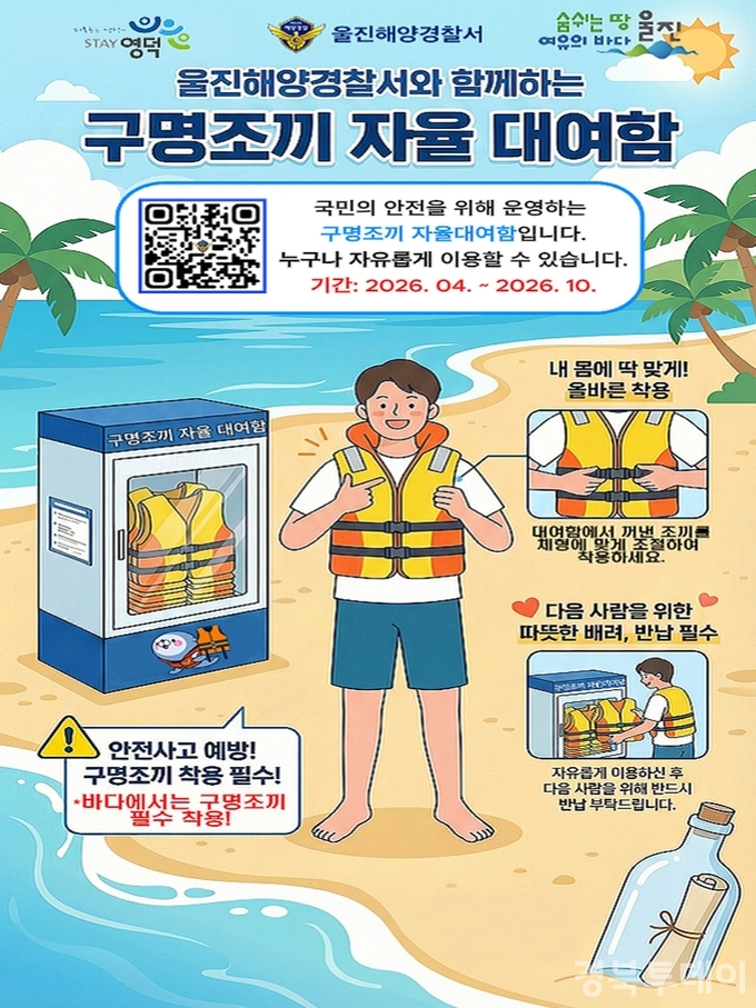 배병학 울진해양경찰서장은 “연안 활동 시 구명조끼 착용은 생명을 지키는 가장 기본적인 안전수칙”이라며 “해양을 찾는 국민들께서는 자율대여함을 적극 활용하고 개인 안전수칙을 준수해 주시길 바란다”고 당부했다.