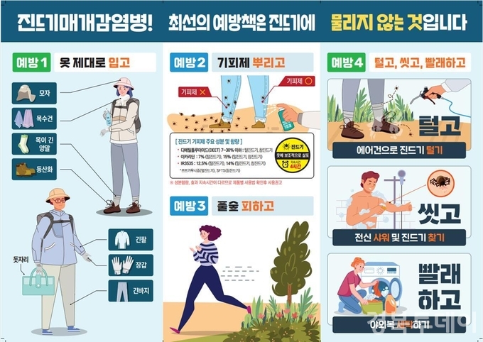 - 기피제 사용: 진드기 기피제를 노출 부위와 의복에 적절히 사용할 것.