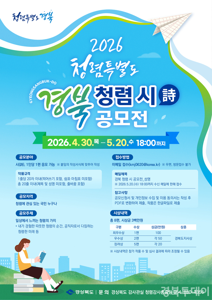 윤성용 경상북도 감사관은 “청렴은 딱딱한 규범이 아니라 일상에서 누구나 공감할 수 있는 가치로 다가가야 한다”며 “이번 공모전에 많은 분들이 자신의 경험과 생각을 시로 표현해 청렴 의식을 되새기는 계기가 되길 바란다”고 말했다.
