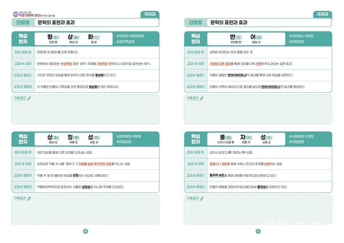 자료는 국어, 수학, 사회, 과학, 미술, 체육, 기술·가정 등 7개 교과를 대상으로 △한자 본래의 뜻 △교과 내 의미 △교과서 활용 예시 등을 체계적으로 정리했다. 특히 교과 간 공통으로 쓰이는 개념어를 따로 묶어 다양한 학습 상황에서 어휘를 연계·활용할 수 있도록 구성한 점이 특징이다. 이를 통해 단순 암기 중심의 한자 교육을 넘어 개념 중심의 융합적 사고력 향상에 기여할 것으로 기대된다.